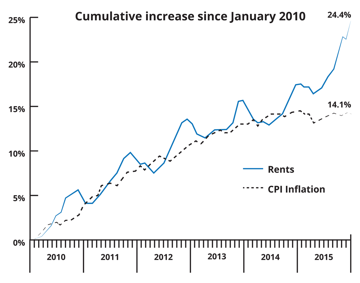 In 2017 the Royal Institution of Chartered Surveyors (RICS) predicted that rents will increase by just over 25% in the coming years. With the already huge increase in the cost of renting a home over the past decade, combined with the above problem for house purchase, this means there is a large cohort of people who can neither afford to buy their own home because they don’t earn enough and don’t have enough disposable income to save for a deposit because their rents are so high, nor are they eligible for social or affordable rented housing because they earn too much.