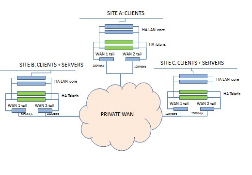 In our case study a pair of T750 Talari units (www.talari.com) were installed as a high availability pair at each site in order to manage CAAD traffic across the network. The Talari units duplicate critical traffic at the source site over WAN 1 and WAN 2. The Talari units at the destination site then take the first packet which arrives and discards the duplicate packet.