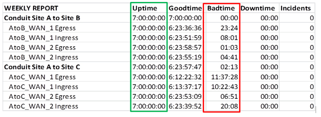 - All of the individual WAN paths experienced some downtime during this period as shown in the Badtime column enclosed by the red box above.