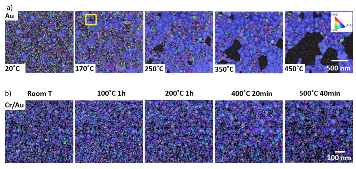 Solid-state dewetting is a phenomenon in which a continuous film agglomerate at elevated temperature forming particles. The importance of understanding the microstructure features influencing this process is two-fold: firstly, avoiding the film breakdown during device operation is essential to ensure functionalities, and secondly, this phenomenon can be employed as an effective tool for fabricating ordered nanoparticle arrays which find applications in, for example, optical devices. Figure 1 (a) shows a series of TKD maps revealing a gold film of 20 nm starts dewetting already at temperatures below 200°C, under 50 Pa water pressure7. Such temperatures are easily achieved during device fabrication and operation. Changing the environment, or adding an adhesion layer, influences the extent of dewetting, as shown in Figure 1(b). A fundamental understanding of the starting point of the dewetting process is essential in order to predict and control the microstructure to avoid dewetting, or to tailor the dewetting depending on the application of interest.