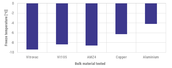 To understand the ice prohibiting properties of amorphous bulk materials or nanocrystalline, several freeze depression tests were carried out at UASKA. The achieved mean water temperature before freezing is shown in Figure 4. Furthermore, the time holding the supercooled temperature is also an indicator of the supercooling performance of the material. With the amorphous metals, like Vit105 and AMZ4, a drop of pure water can be supercooled for over two hours, while the droplets on the other two materials freeze during the cooling.