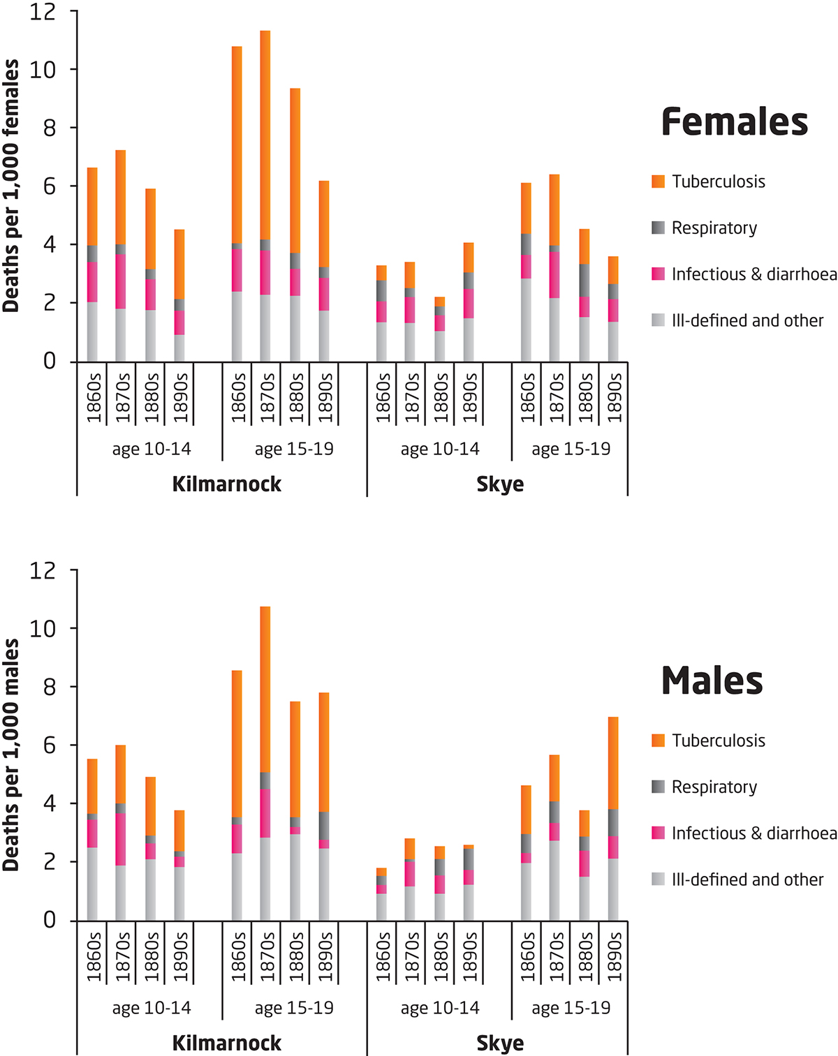 Male death rates from TB were considerably higher than for females in Skye resulting from selective outmigration of healthy people, particularly males, coupled with their return migration when chronically ill. The death certificates provided valuable information on the duration of the illness leading to death and for those dying from TB on Skye was 18 months to two years, giving sufferers time to travel home for care. Those suffering from acute infections would have had less opportunity and possibly inclination to migrate back to the communities of their birth from which they had emigrated. Rural locations which experienced higher out-migration of a particular sex were, therefore, more likely to experience higher mortality rates from all causes due to the loss of healthy emigrants and from TB, in particular, because return migrants were frequently unhealthy. This data provides limited support for the bargaining-nutrition explanation and suggests that exposure to infection was of far greater significance.