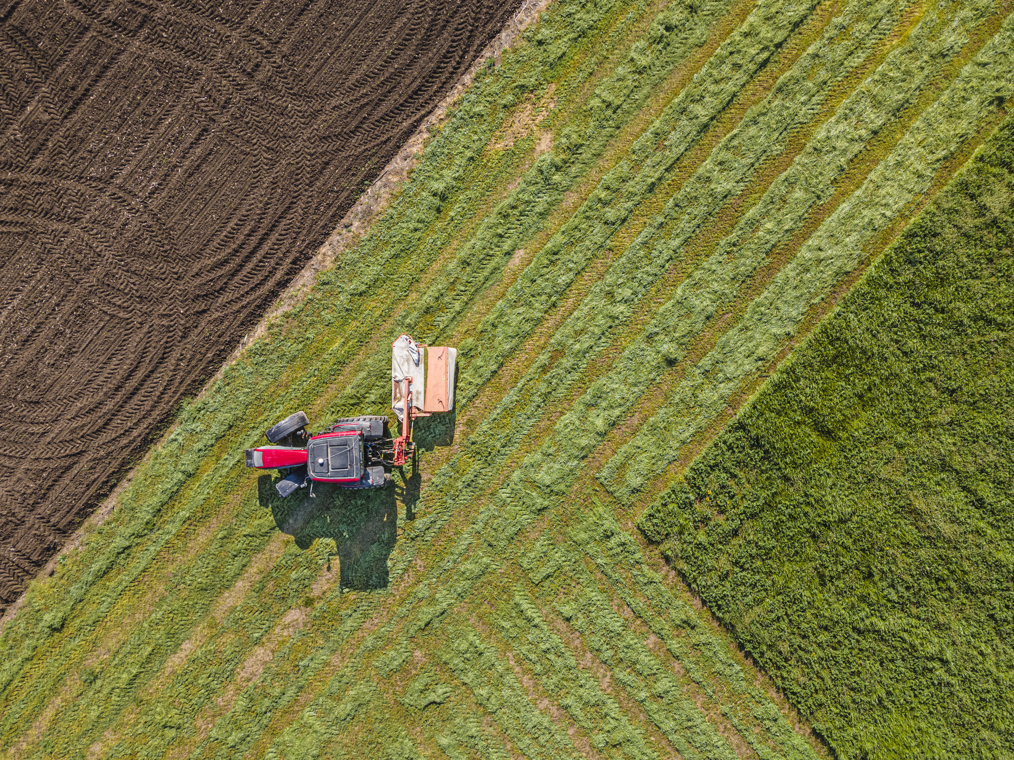 Aerial view of tractor mowing alfalfa. Springtime agriculture.