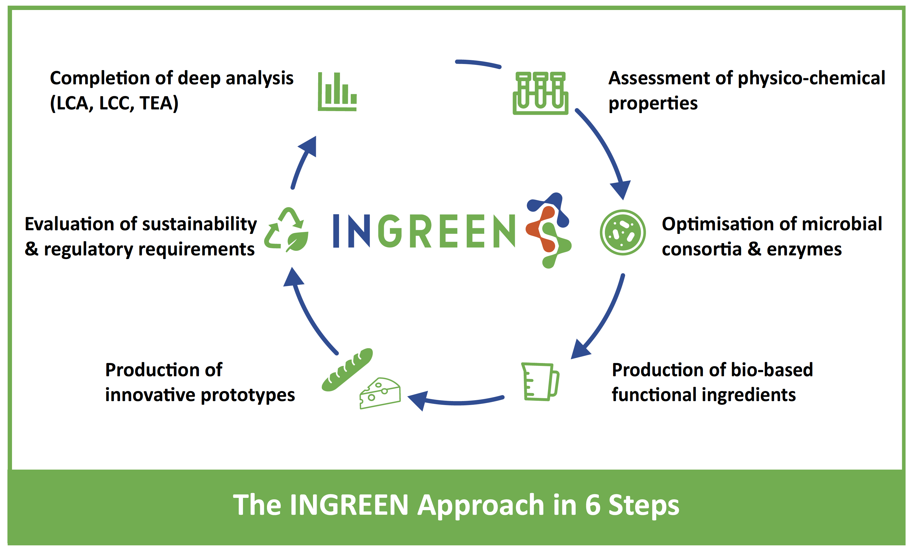 The INGREEN project, funded by the Bio-based Industries Joint Undertaking, addresses the challenge of food and paper & pulp waste by capitalising on the market opportunities for functional ingredients and bio-based chemicals. In real operational environments, INGREEN will demonstrate sustainable, efficient, and safe biotechnologies and eco-friendly approaches to produce health-promoting functional food ingredients and raw materials. Innovative bio-based prototypes will be produced for the food, feed, pharmaceutical, cosmetic and packaging sectors.