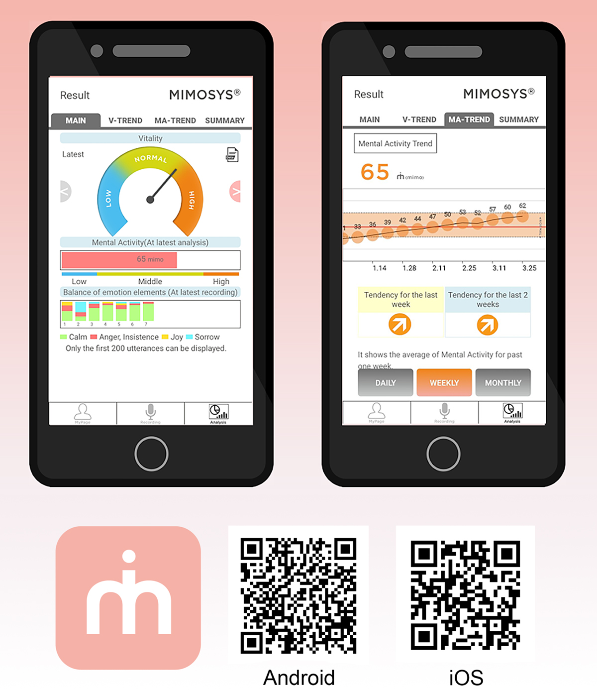 Unlike biomarkers obtained from other specimens, voice analysis is cost-effective because it does not require special devices or reagents and it can be measured repeatedly using non-invasive and simple methods. Therefore, it can be used not only for screening but also for household monitoring, which may enable early detection of disease. Taking a slightly different approach, we focused on the reduction in emotion expression that manifests when a person is stressed or depressed and developed the app­lication ‘MIMOSYS (Mind Monitoring System)’, which automatically monitors the mental health of the owner of the smartphone from their voice during conversations on the smartphone (Tokuno et al., 2018). This system is based on voice Sensibility Technology (ST), which captures emotions from changes in the basic frequency of the voice. MIMOSYS calculates ‘Vitality’, which is the degree of mental health, from the percentage of emotion within the measured conversation by ST.