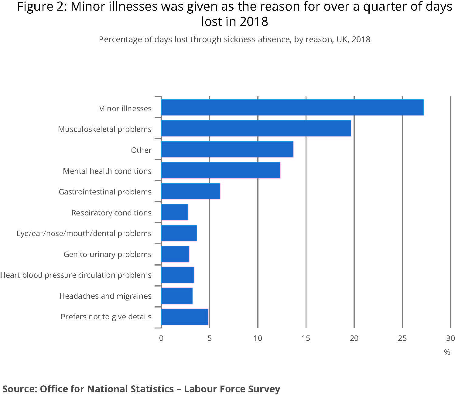 Minor illnesses were the most common reason for sickness absence in 2018, accounting for 27.2% (38.5 million days) of the total days lost, followed by musculoskeletal problems, at 19.7% (27.8 million days) and mental health at 12.4% (17.5 million days).