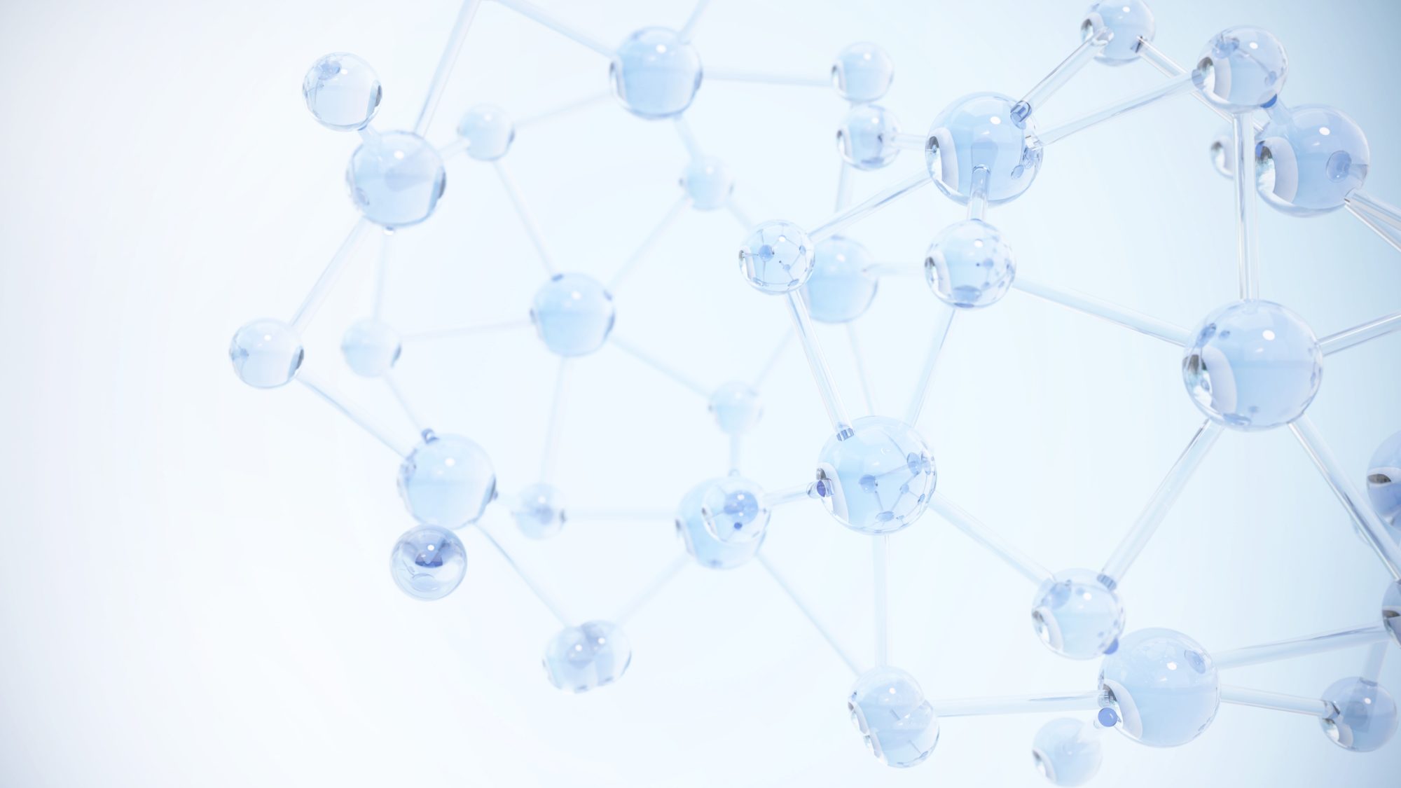 A close-up view of glowing molecular structures under a blue background representing scientific research and chemistry concepts