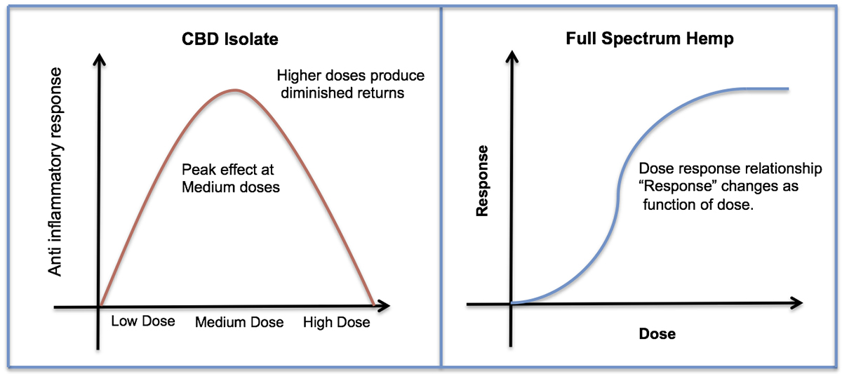 As can clearly be seen, the isolate displays a bell-shaped response curve, whereby an increase in dosage results in an optimal phase followed by a drop-off effect, conversely the full-spectrum hemp displays a plateau phase and no drop-off.