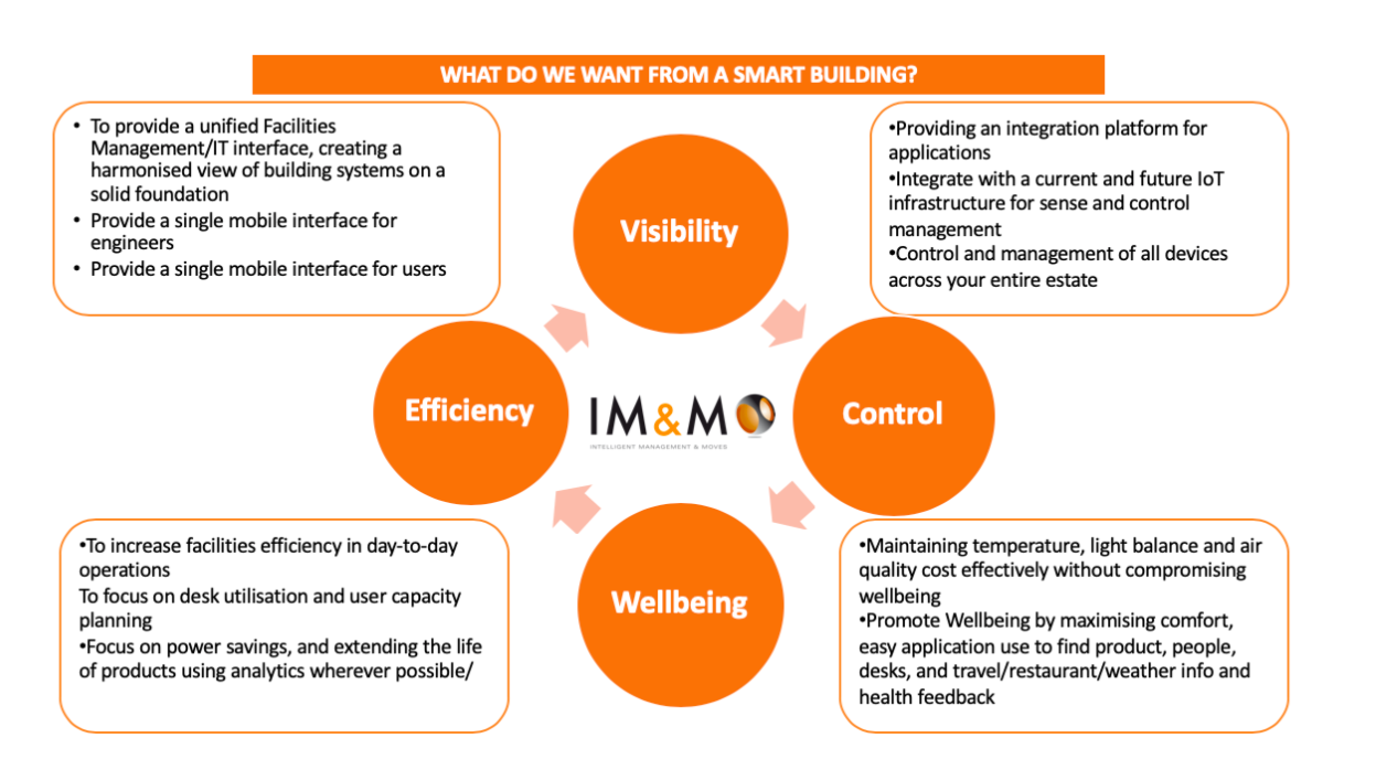 The “Wellbeing” of the people who use buildings should be at the forefront of every business, especially in these difficult times. Post lockdown people are going to need to feel safe and it will be critical that the working environment is geared to the needs of the people returning to work. As can be seen from the diagram below Wellbeing is one of the fundamental pillars of a smart building and something that we at IM&M are seeing an increasing demand for solutions that help address this area.